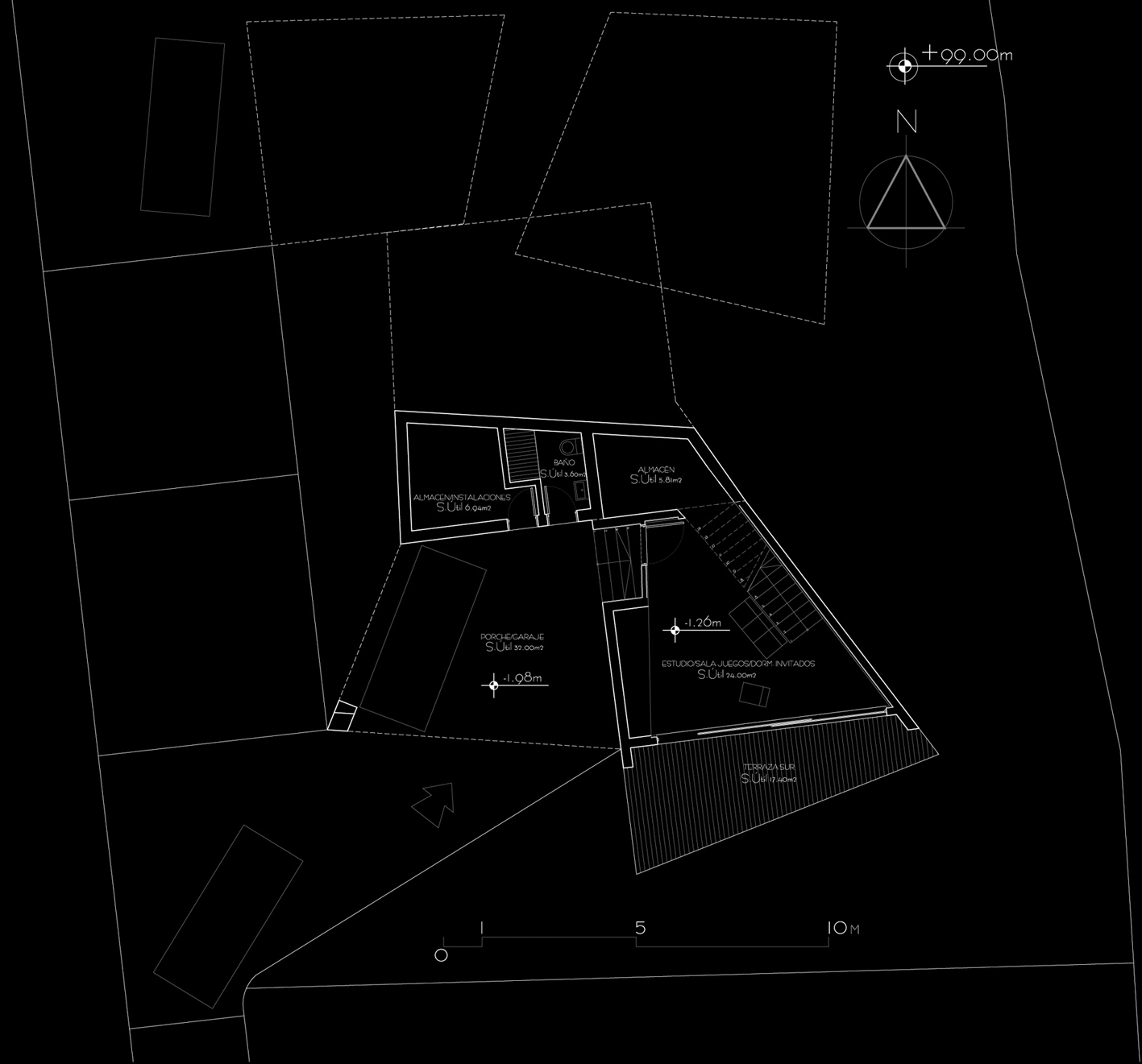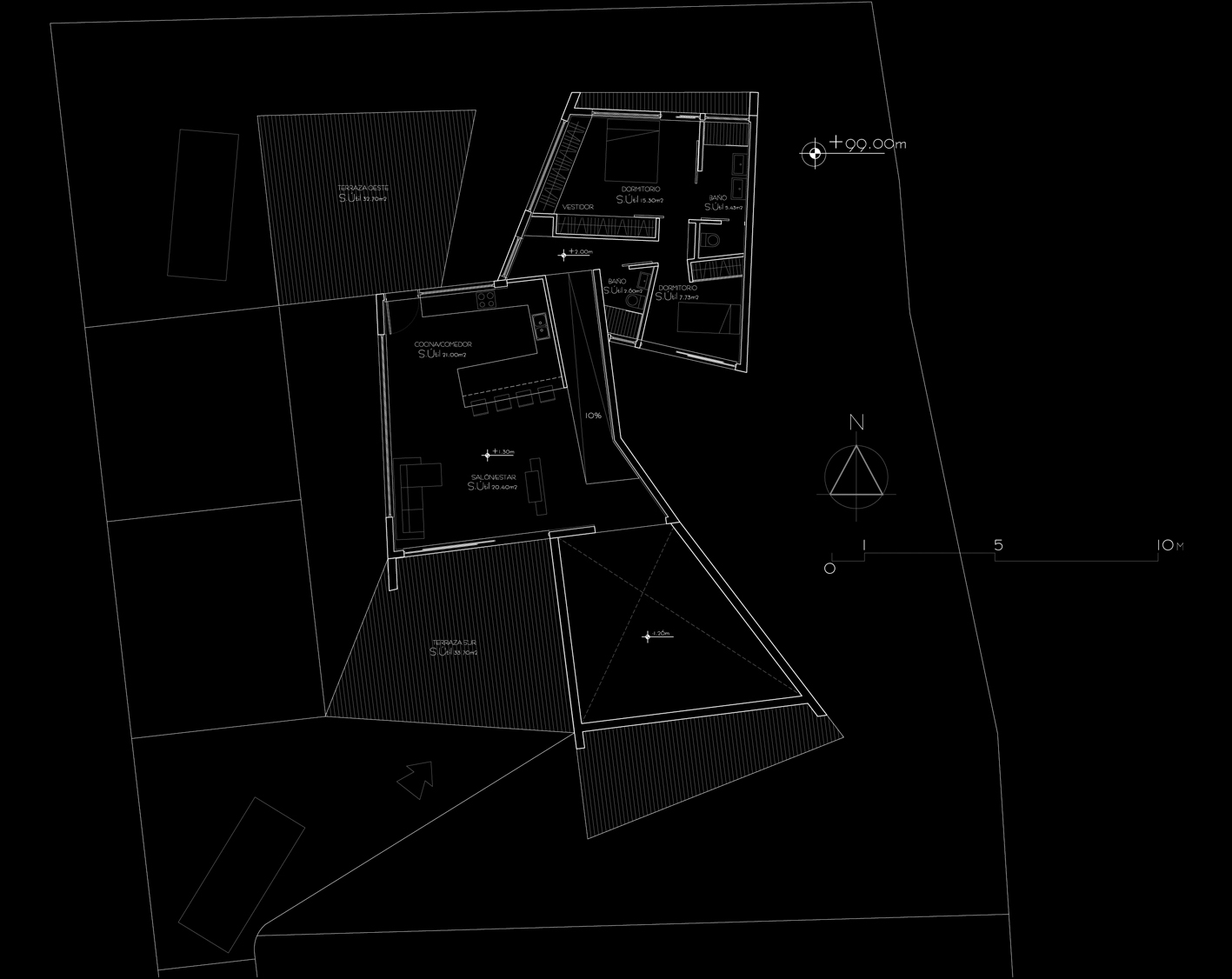 Proyecto del año 2010 para la realización de una vivienda unifamiliar en un solar de unos 500m² en Las Norias, en el término de Tazacorte, en La Palma. Se trata de una vivienda que aprovecha la pendiente del terreno para escalonarse y poder conseguir así capturar todas las vistas del horizonte y las puestas de sol. Las estancias vivideras se desarrollan en los niveles inferior e intermedio, mirando al mar, mientras que los dormitorios vuelcan sus vistas hacia la Caldera de Taburiente buscando mayor privacidad.